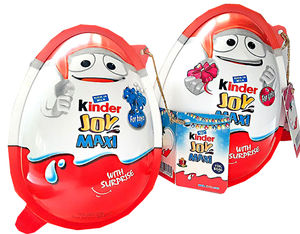 Die beiden Kinder Joy Eier rechts können durch Anklicken vergrößert werden. Neu daran ist, dass es Maxi Kinder Joy Eier sind. Das Motiv verrät, dass die Eier für die Weihnachtszeit sind. Das Linke Maxi Ei ist "For boys" und das rechte "For girls".