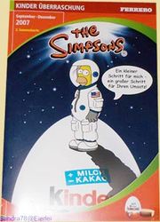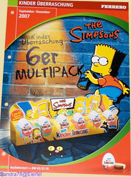 Die ersten Bildbeweise sind heute im Eierlei Forum hochgeladen worden (Dank Sandra78). Das Bild links zeigt die Titelseite von der Ferrero Vertreter Mappe. Homer steht auf einem Ü-Ei als Astronaut. Ausgeliefert werden die Simpsons im September. Auf dem zweiten Bild rechts ist ein 6er Pack der Simpsons. Das 6er Pack wird am 22. 10. 2007 ausgeliefert. Diese Seite aus der Mappe beinhaltet 10 Figuren der Simpsons. Jede Simpsons Figur zeigt bekannte oder besser noch eine typische Haltung zu den Charakteren. Über diesen Link zum Forum gibt es weiteres Bildmaterial der Simpsons. [Eierlei Forum Simpsons Beitrag]