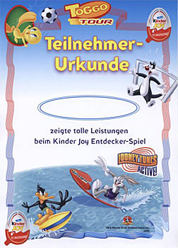 Der TV Sender Super RTL geht mit der Sendung Toggo auf Tour und veranstaltet Events. Am Wochenende war Toggo in Potsdam und hat zu einer neuen Runde "Kinder Joy Entdecker-Spiel" auf dem Luisenplatz eingeladen. Um sich für die Hauptrunde zu qualifizieren, musste an dem klassischen Eierlaufspiel (Esslöffel im Mund/oder in der Hand mit einem Ei drauf und dabei eine gewisse Distanz gegen einen Gegner laufen, ohne dass das Ei herunterfällt) erfolgreich teilgenommen werden. Als Ei wurde natürlich ein Kinder Joy Ei benutzt, dass kann auch ruhig mal herunterfallen. Jeder Finalist bekam so ein Kinder Joy T-Shirt, welches die grüne und blaue Gruppe kennzeichnete. Das Bild zeigt die Shirts von der Rückseite, wo unter den Looney Tunes Logos zwei Figuren zu sehen sind. Auf der Vorseite ist ein Kinder Joy Ei als kleines Brust Logo abgebildet. Jeder Teilnehmer bekam so eine Urkunde, wo in der Mitte der Name eingetragen wird. Der Hauptgewinn einer Verlosung war ein 3-tägiger Aufenthalt im Euro-Disneyland Paris. Das Beste kommt zum Schluss, dass "Kinder Joy Entdecker-Spiel" ist noch nicht zu Ende, alle Termine in der Übersicht auf [www. kinder-joy. de] unter der Rubrik "Toggo Tour". Danke für die Bilder und News an den Eierlei User matlar12. Mehr Informationen und Bilder im [Eierlei Forum].