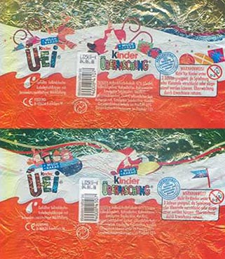 Das Bild zeigt uns zwei neue Umverpackungen vom Ü-Ei. Die neuen Weihnachtverpackung kommt etwas spät, wenn man bedenkt, dass die Weihnachtsachen schon 2 bis 3 Monte vor Weihnachten in den Läden anzutreffen sind. Gut möglich, dass es sich nur um Testverpackung handelt, die im nächsten Jahr flächendeckend erscheinen wird. Wir denken schon, dass die Weihnachtsverpackung dazu animiert noch eine Ü-Ei zu Weihnachten mitzuschenken. Schade ist, dass die Inhalte die gleichen geblieben sind, wie in den anderen Ü-Eiern.