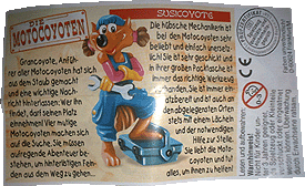 Bei der noch aktuellen Herr der Ringe Serie war der BPZ das erste was bekannt wurde, genau das Gegendteil ist bei den Motocoyoten der Fall. Auf eBay sind schon lange die Motocoyoten zu ersteigern, dass waren aber bis jetzt nicht die deutschen. Hier nun die ersten Bilder der Motocoyoten BPZ, Links zu sehen ist die Vorderseite mit allen 10 Figuren in Aktion im gewohnten Großformat und Glanzpapier. Die Rückseite der Coyoten zeigt den BPZ zur Figur, in diesem Fall von "Susicoyote"! Der Text unter dem Namen "SUSICOYOTE" beschreibt eine Kurzgeschichte über die Figur um damit den Charakter zu schildern! Der Text links von Susicoyote ist auf allen BPZ einheitlich und gibt Aufschluss über die Serie, die wir Euch nicht vorenthalten wollen: Grancoyote, Anführer aller Motocyototen hat sich aus dem Staub gemacht und eine wichtige Nachricht hinterlassen: Wer ihn findet, darf seinen Platz einnehmen! Vier mutige Motocoyoten machen sich auf die Suche. Sie müssen aufregende Abenteuer bestehen, um hinterlistigen Feinden aus dem Weg zu gehen. . . [Live Suche nach den Motocyototen auf eBay. de starten]