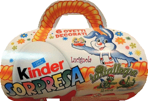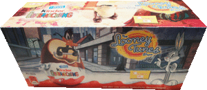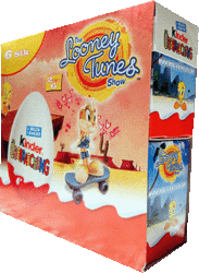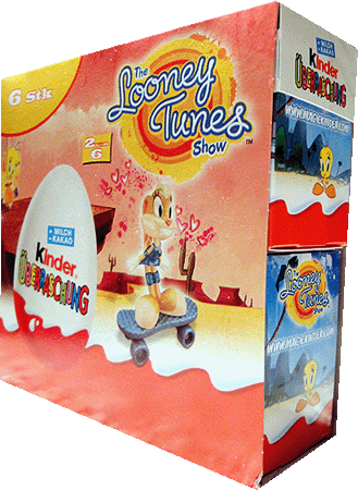Aus der Schweiz kommt dieses 6er Pack. Enthalten sind Figuren von "The Looney Tunes Show". Auf dem Foto kann man schön sehen, dass dieses 6er Pack aus zwei 3er Packs besteht. In jedem 3er Pack wird eine Figur der Serie garantiert. Danke an Andreas H. für die News Rechts ist ein 3er Pack der Looney Tunes zu sehen. In Italien gibt es unter anderem dieses 6er Tragetaschen Pack der Tartallegre. In dem 6er Pack werden 2 Figuren garantiert. Desweiteren gibt es noch ein 4er Pack zur Serie, beide in österlichem Design. [Die Tartallegre im Eierlei Shop].
