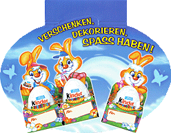 Mit diesen beiden Palettenanhängern (PAH) werden die kommenden 6er Packs Osterhasen beworben. Die beiden typischen PAH Löcher haben diese PAH nicht. Auf dem ersten PAH steht der Slogan "6 Freunde Überraschen!". Auf beiden PAH wird schnell klar, dass die Packs getrennt werden können, so dass sie auch einzeln verschenkt werden können. Unten auf der Verpackung ist eine Freifläche mit dem Vordruck "Für", wo der Namen des Beschenkten eingetragen werden kann. Auf dem rechten PAH steht der Slogan "Verschenken, Dekorieren, Spass haben!", womit zusätzlich darauf hingewiesen wird, dass die Ü-Eier im Hasenverpackung eine gewisse Dekor zu Ostern darstellen. [Erwerbmöglichkeit des PAH und weitere Infos]