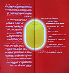 Vom 2. April bis zum 30. Mai wird im Museum in Frankfurt eine Ü-Ei Ausstellung zum 30 jährigen Geburtstag stattfinden. Genau für die Ausstellung wurden A0 Plakate entworfen (siehe Bild links)!Im gleichen Layout werden Informationskarten ausgeliefert. Der Slogan der Werbeaktion lautet "DAS GELBE VOM EI"! Im Mittelpunkt steht symbolisch eins der gelben Ü-Ei Kapseln. Überschrift "30 Jahre kinder Überraschung", Untertitel "Museum für Angewandte Kunst Frankfurt". Auf den Plakaten und Karten sind alle wesentlichen Informationen zu finden wie z. B. die Öffnungszeigen, Eintritt (5 Euro, ermäßigt 2,50 Euro), Führung und das wohl Außergewöhnlichste "Künstlerworkshop für Kinder und Erwachsene" Zitat: 30 Jahre kinder Überraschung. Filz ist Kult[ur]. Handgefilzte Ei-Objekte vermitteln eine harmonische, warme Ausstrahlung und sind stets Unikate. Dieser Workshop findet am 3. April von 10 - 17 Uhr statt (Preis pro Person 50 Euro)! A2 Plakat kaufen auf [eBay] oder im [Shop] [Alle Informationen zur Museumsausstellung in Frankfurt] oder hier [www. museumfuerangewandtekunst. frankfurt. de]