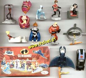 Das Bild zeigt die 8 Comic Helden der Unglaublichen. Im unteren Teil des Bildes sind der BPZ und die drei Fahrzeuge zur Serie zu sehen. Hierbei handelt es sich zwar um die italienischen Inhalte und BPZ, aber es werden sehr wahrscheinlich exakt die gleichen Figuren wie die Deutschen sein. Diese Serie ist wie die Polar Express Serie eine Mischungen aus Figuren und Spielzeug. Zu den beiden Flugobjekten gehört ein Ständer. Auslieferungsstart der Unglaublichen ist der 3. Januar.