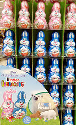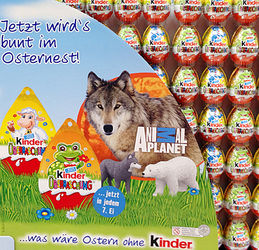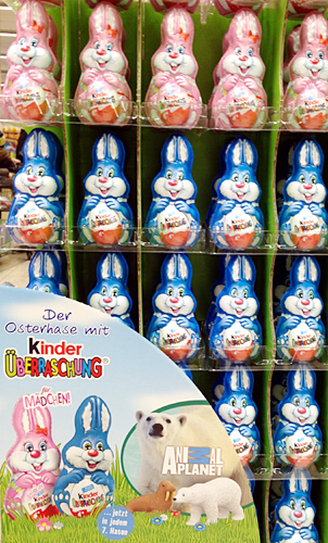 Das Foto zeigt uns einen Teilausschnitt vom großen Ü-Eier Aufstelller. Die einzelnen Ü-Eier haben eine extra österliche Umverpackung. Oben an der Umverpackung ist ein Loch, womit das Ü-Ei an-, bzw. aufgehängt werden kann. In den Eiern stecken Figuren der Serie Animal Planet, aber nur in jedem 7. Ei und nicht wie bei Star Wars in jedem Ei. Weitere Überraschungseier gibt es in diesem Aufsteller. Die Osterhasen für Mädchen und Jungen enthaltenje ein Ü-Ei. Hier wird ebenfalls damit geworben, dassin jedem 7. Ei eine Figur der Serie Animal Planet steckt.