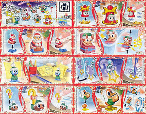 Das Bild zeigt uns eine Collage von den 7 unterschiedlichen Beipackzetteln der Weihnachtshelfer 2012. Der erste Beipackzettel zeigt die Vorderseite von der Serie. Die 7 Figuren sind funktional, wie z. B ein Stempel oder Geschenkbandkräusler. Die komplette Serie wird in dem Adventskalender stecken.
