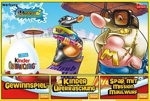 Auf Kinderueberraschung. de kann man seit heute auf das grüne Schild mit der Aufschrift "Das große Mission Maulwurf Gewinnspiel ab dem 21. 08. 06" klicken und kommt dann auf toggo. de zu dieser Auswahl (siehe Bild)! Dort kann man an einem Gewinnspiel teilnehmen, bei Kinder Überraschung kommt nur ein Bild und bei Spaß mit Mission Maulwurf ist richtig was los. Es kann einem Spiel beigetreten werden oder ein schönes Poster von Mike Mission runter geladen werden und zu guter letzt können alle Figuren zur Serie in einer Art Diaschau angeschaut werden.