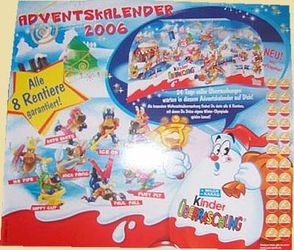 In Österreich gibt es das Halloween 4er Pack. Das Bild zeigt die Vorder- und Rückseite. Hinten steht "6 tolle Hallowen-Spuk Figuren mit Kinder Überraschung". Danke für die News an" Lg Puh71" Der Adventskalender 2006 ist in Österreich schon zu bekommen. Die Rückseite des Kalenders garantiert für den Rentier Satz. Oben rechts auf dem Bild sieht man, dass der Kalender aufgeklappt werden muss. Der Kalender sollte in Kürze auch in Deutschland zu kaufen sein. Alle Details zu den Inhalten mit Bildern gibt es im Forum. [Zum Beitrag im Eierlei Forum]