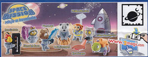 Die Space Mission ist in Polen gelandet. Rechts zu sehen sind zwei unterschiedliche 4er Packs der Serie. Unter den 4er Packs haben wir den Beipackzettel der Serie abgebildet. Dort sind schön alle 7 Figuren zu sehen. Bei den Figuren handelt es sich um sogenannte funktionelle Figuren, wie z. B. Pies Lupi mit Lupe. Zur Serie gibt es ein Superpuzzle, welches aus 4 Puzzleecken besteht. In Ungarn werden die Figuren ebenfalls herausgebracht. Auf eBay sind die ersten Sätze der Serie zu bekommen: [Live Suche nach der SPACE MISSION starten].