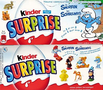 In Polen gibt es diese beiden 4er Packs der neuen Funny Students Figuren. Pro 4er Pack werden 2 Figuren der Serie garantiert. Quelle: [Diese eBay Auktion] Die beiden Eier rechts kommen aus Italien, es sind Gransorpresa. In den Eiern sind Inhalte von New Holland und Hello Kitty. In Belgien gibt es jetzt dieses 3er Pack von den neuen Schlümpfen. Damit breiten sich die Schlümpfe langsam aber sicher aus. Eine Schlumpffigur wird pro 3er Pack garantiert. In Italien sind jetzt die ersten Angels & Friends 2 Figuren zu bekommen. Das Bild zeigt ein 72er Thekendisplay. [Die ersten Sätze auf eBay von Angels & Friends 2]. Im Shop können wir den ersten Satz von Angels & Friends anbieten und die Schlümpfe aus Italien. [Zum umfangreichen Ü-Ei online Shop]