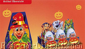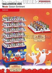 Zum Halloween 2005 kommen wieder die schon bekannten 6er Packs. Rechts zu sehen ist ein ganzes Werbeblatt. Auf dem Werbeblatt ist ein Aufsteller zu sehen, bestückt mit den 6er Packs. Der bereits vorgestellte PAH von den deutschen Monster Hotel Figuren hat keine Löcher, so dass wir davon ausgehen, dass der PAH zu den 6er Packs gehört. Deswegen sollten die Monster Hotel Figuren in den Halloween 2005 Eiern sein. Jetzt ist leider noch nichts an den Aufstellern oder der Verpackung von den Monster Hotel Figuren zu sehen. Die Monster Hotel Figuren würden natürlich sehr gut zu den Halloween Sachen passen und bestimmt von vielen Sammler begrüßt werden.