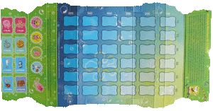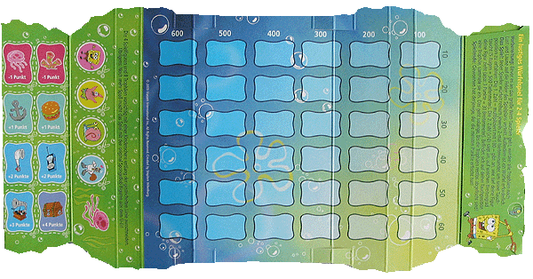Im 6 Pack der SpongeBob schlummert ein Spiel welches wir vorstellen möchten. Das Spiel ist in die Innenseite der Pappverpackung gedrückt. Dieses breite Bild zeigt uns die Spielfläche. Links sind Preis und Figuren zum Ausschneiden. Laut Spielregeln werden die Preise willkürlich auf den Feldern verteilt. Um diese Preise zu bekommen wird nach Breitengrad Prinzip (Schiffeiersenken) gewürfelt. Gewonnen hat derjenige, der die höchste Punkzahl (die auf den Preisen stehen) erreicht hat.