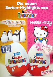 Heute ist der Start der beiden neuen Überraschungseier Serien. Das Bild zeigt uns ein Klebeposter, wo links die Pinguine von Madagascar zu sehen sind und rechts Hello Kitty. Das Klebeposter hat die Maße von 30cm mal 42cm. Im November ist der Kinofilm von den Pinguinen gestartet. Hier der deutsche [HD Trailer]. Zu bekommen sind die Klebeposter in [dieser eBay Auktion].