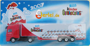 Die Auslieferung des neuen Ü-Eier Trucks 2007 hat sich auf Ende Juni verschoben. Die Gründe sind Verbesserungen im Detail. Das Bild zeigt uns den Truck in voller Pracht mit Blister. Der Schriftzug "FERRERO" an der Fahrerkabine und seitlich an der Fahrerkabine zeigen ein neues feines Detail. Am Ende des Trucks ist der Eiermann, der seine Hände über die Eier hält. Dieser Eiermann wurde extra für den Truck von Ferrero entworfen. In der Regel werden die Eiermänner in den bekannten Positionen verwendet. Bei dem Truck gib es immer ein Motto wie z. B. der Formel Ü-Ei Truck, der auf Formel 1 getrimmt war. Der kommende Truck läuft unter dem Motto Eiertruck. Die farbige Rückseite des Blisters ist ein weiteres schönes Detail für Sammler. Oben ist das Feld, wo die fortlaufende Nummer von 0 bis 2000 eingestempelt wird. Da sich der Termin um einen Monat verschoben hat, werden die Trucks jetzt per Luftfracht nach Deutschland gelangen. Wir hoffen, dass nichts mehr dazwischen kommt wie z. B. Probleme mit dem Zoll oder etwas Unvorhersehbares. Im Eierlei Shop lief die Vorbestellung so gut, dass wir Momentan keine Trucks mehr anbieten können. Eventuell können wir nach Auslieferung noch ein paar nicht abgerufene Trucks anbieten. Auf Eierlei gibt es eine extra Truck Seite, wo die vorigen Trucks zum Teil mit Prototypen aufgelistet sind. [Zur Eierlei Truck Seite]