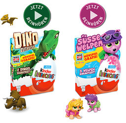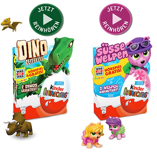 In den neuen 4er Packs steckt ein Code, der auf [kinderueberraschung. de] eingegeben werden kann, um ein Hörspiel abzurufen. Die Kurzhörspiel gibt es einmal zu den Dinos und einmal zu den Süssen Welpen.