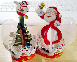 Neue Weihnachtseier als Werbeartikel in China. Es gibt zwei verschiedene Eier aus transparentem Kunststoff, eines mit Weihnachtsbaum und eines mit Weihnachtsmann. Wenn man alles zusammenbaut, kann man die mitgelieferte Flüssigkeit reingeben und die Umrandung quillt auf (hier auf dem Bild noch im Normalzustand). Sehr geckig und mal was Neues. Quelle: [Diese eBay Auktion] Test Mini Maxi Satz aus Italien. Die Eier heißen "BIG" Kinder Sorpresa. Es gibt 6 verschiedene Inhalte für Mädchen, wie hier auf dem Bild zu sehen und 6 verschiedene Inhalte (Autos, Flugzeug usw. ) für Jungen. Quelle: [Diese eBay Auktion]