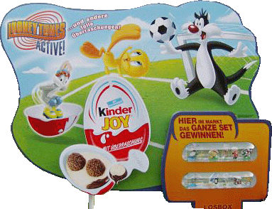 Diese Werbetafel wird an einem Metallstativ gehalten und meistens zwischen vier Aufstellern platziert. In der Werbetafel ist ein Satz Bugs Bunnys integriert. Dieser Satz kann in jeder Filiale gewonnen werden. Vielleicht sind in den Röhren Varianten der Bugs Bunnys dabei, so wie es bei den Strandnasen der Fall war. Bugs Bunny Figuren gibt es im Eierlei Shop: [Shop] [Bugs Bunny] [Wühlkiste] [Sonderangebote].