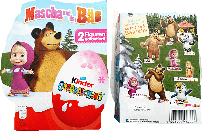 Von der aktuellen Überraschungsei Serie Mascha und der Bär gibt es dieses vierer Pack. Pro Packung werden 2 Figuren der Serie garantiert. Auf der Rückseite sind alle acht Figuren der Serie zu sehen. Auf dem gelben Post-it Zettel ist noch der Hinweis "Jetzt mit Innenseite zum Ausmalen & Basteln".