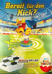 Das Werbeposter der Magic Sport gibt es in zwei Größen. Der Werbeslogan "Bereit für den Kick" spielt darauf an, dass mit den Figuren eine Mini-Weltmeisterschaft gespielt werden kann. Am Sockel der Figur steht noch "MAGISCH MAGNETISCH". Das Poster belegt eindeutig, dass der offizielle Auslieferungsstart im Februar ist. Zu bekommen sind die Poster in eBay Auktionen, einmal in der Größe [42 x 29cm] und in [59 x 42 cm]! Live Suche auf eBay nach Magic Sport Poster starten