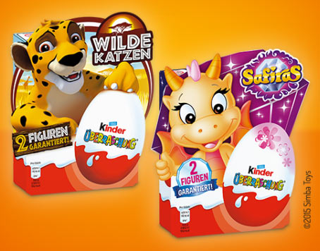Auf dem Bild zu sehen sind die beiden neuen 4er Packungen Überraschungseier. Der Figurensatz "Wilde Katzen" besteht aus 4 Figuren, genau wie die "Safiras". Die Safiras sind vier niedliche Drachen Figuren.