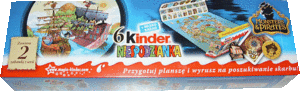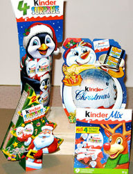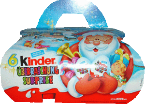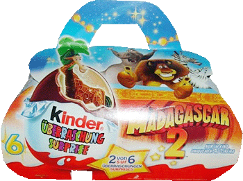 In Polen ist von der Monsters & Pirates Serie dieses 6er Pack erschienen. Im 6er Pack sind zwei 3er Packs enthalten. Die Besonderheit des 6er Packs ist die lange Verpackung. Auf der Innenseite der Verpackung ist ein Spiel zu den Figuren aufgedruckt. In der Schweiz ist dieses 6er Packs erschienen. Das linke 6er Pack ist mit dem Weihnachtsmann versehen. Das rechte Bild zeigt die MADAGASCAR 2 Serie auf der Verpackung. Laut Verpackung werden 2 Figuren der MADAGASCAR Serie garantiert. Danke an Andreas H. für die Bilder Aus Kanada haben wir diese beiden Bilder bekommen. In der linken Kung Fu Panda Verpackung sind zwei Ü-Eier enthalten und drei Kinderriegel. Auf dem rechten Bild ist ein 4er Pack Ü-Eier zu sehen, sowie eine große Weihnachtskugel. Der Tannenbaum ist ein weiteres 4er Pack Ü-Eier und als letztes die Kinder Mix Verpackung, wo der Elch das Tablett mit dem Inhalt auf der "Hand" trägt. Danke an Wolfgang M. für die Bilder und grüße nach Kanada.