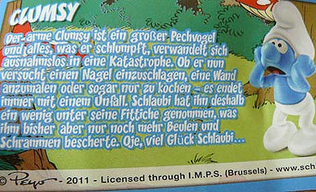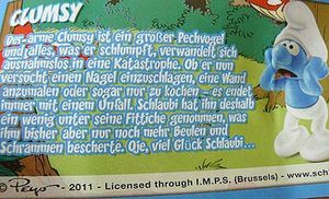 Dies ist der erste BPZ der deutschen Schlümpfe. Auf der Vorderseite sind alle 8 Figuren zu sehen und mit Namen versehen. Der Rückseite zeigt, dass es sich um den BPZ von CLUMSY handelt. Um den Charakter von CLUMYS zu beschreiben, gibt es eine Kurzgeschichte. Auslieferungsstart der Schlümpfe ist der 27. 12. 11. [Zu bekommen in dieser eBay Auktion]