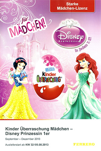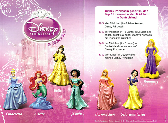 Von den kommenden Disney Prinzessin Figuren gibt es diese Werbemappe von Ferrero. Die für Mädchen gedachte Serie ist im typischen lila pastell Farbton. Die Serie startet parallel zu den Schlümpfen im August. Die geöffnete Werbemappe zeigt die 7 Figuren zur Serie. Hier die Namen der Prinzessinnen von links: Cinderella, Arielle, Belle, Jasmin, Dornröschen, Schneewittchen und Rapunzel. In dem Texfelt ist noch erfasst, wie bekannt die Prinzessinnen sind.