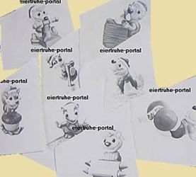 Das Bild zeigt die kommende Adventskalender Serie. Es scheint eine Biber Serie zu sein. Die Figuren sind funktionell ausgestattet wie die Weihnachtswichtel, welche u. a. ein Klebeband für Geschenkpapier bereithalten, Locher, Stempel usw.