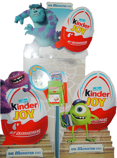 Um noch mehr Aufmerksamkeit zu bekommen, gibt es diese Pappaufsteller von der Monster Uni. Die Figuren auf den Pappaufstellern stehen immer in Verbindung mit dem Kinder JOY Ei wie z. B. Art, der auf dem Ei hängt. Die Hauptfiguren sind hier wieder Sully und Mike Glotzkowski. Das Gebinde kann man nur in den Filialen sehen, wo es die 864er Aufsteller gibt. Bei den Figuren handelt es sich um Charaktere aus dem neuen Film, der am 20. 6. 2013 startet. [Hier gehts zum deutschen Trailer in HD von "Die Monster Uni"]. Das Bild zeigt eine Vergrößerung von der Mitte des Aufstellers. Über dem verzerrten Spiegel steht "GUCK WIE EIN MONSTER". Und über der Losbox ist das Spiel "MONSTER-FALLE" zu sehen, welches es zu gewinnen gibt. Dieses Spiel gibt es auch im öffentlichen Handel. Die Monster Uni jetzt im [Eierlei Shop]. Danke für die News an unsere Moderatorin Sandra78