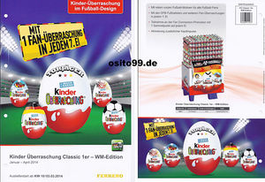 Zur Fußball Weltmeisterschaft 2014 wird es eine extra Ü-Eier Kollektion geben. Die Werbemappe zeigt uns schon mal vorab ein paar der neuen Umverpackungen mit tollen Fußball Motiven. In den Ü-Eiern stecken, so wörtlich, "Mit den DFB Fußballstars und weiteren Fan Überraschungen in jedem 7. Ei". Auslieferungsstart ist der 03. 03. 2014
