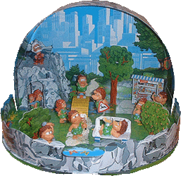 Links zu sehen ist das Diorama der Ötzis im aufgeklappten Zustand. Die Ötzis sind in einem Park in dem sich ein Kiosk, eine Brücke, eine Höhle, eine Parkbank, Bäume und noch vieles mehr befinden! Im Hintergrund des Diorama sind Wolkenkratzer zu sehen. Der Ötzi Opa mit dem Namen "Cheffe" steht links oben auf der Höhle und schaut was die anderen Ötzis so treiben. Hier ist auch zu sehen, dass die Figuren kaum aus zwei Teilen bestehen.