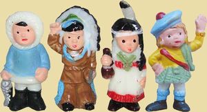 So eine Ü-Ei Figuren News hatten wir bis jetzt noch nie. Zu dem Indianerjungen / Indianermädchen und dem Schottenjungen gehört noch eine vierte Figur, und zwar der Eskimojunge. Der Eskimojunge wurde von mehreren Ü-Ei Experten angeschaut und alle sind zum gleichen Entschluss gekommen, dass die Figur ganz sicher zu dem Satz gehört. Der Eskimojunge ist mit genau den gleichen Farben bemalt, wie die anderen Figuren. Ein Vergleich ist z. B. das Hellblau vom Indianerjungen und Schottenjungen mit dem Hellblau vom Eskimojungen. Der Eskimojunge hat unter den Füßen die Kennung H K für Hong Kong genau wie die anderen Figuren. Der UV Lichttest hat ergeben, dass das Grundmaterial genau so leuchtet wie von den anderen Figuren. Die Farben haben sich unter UV Licht ebenfalls genau gleich verhalten, so dass der Eskimojunge 100%ig dazugehört. Wahrscheinlich gehören noch mehr Figuren zu dem Satz, was wir aber noch nicht bestätigen können. Mehr dazu in einer anderen Eierlei News. Warum ist der Eskimojunge erst jetzt bekannt geworden? Diese Frage haben wir uns gestellt und etwas rescherschiert. Ein Händler auf der letzten Dreieich Börse hatte den Eskimojungen schon und hat ihn zu DM Zeit für 700 DM verkauft. Damit wird schon deutlich, dass der Eskimojunge viel seltener als der Indianerjunge, das Indianermädchen und der Schottenjunge ist. Vielleicht hat ja jemand von Euch diesen Eskimojungen, dann bitte kurz was in den Artikelkommentar schreiben.