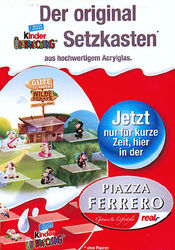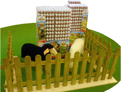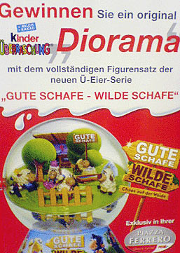 Von den Schafen gibt es einen Setzkasten, wie wir ihn schon von den Bugs Bunny kennen. Als Kulisse dient eine Schafweide mit Stall. Zum bekommen ist der Setzkasten bei Real für 24,90 Euro Das Werbeblatt kündigt ein Gewinnspiel an, wo ein Diorama der Schafe gewonnen werden kann. Ein wahrer Hingucker von Jung und Alt sind diese beiden lebensgroßen Schafe. Nur blöd, dass ein Zaun drum ist und man so nicht an die Ü-Eier kommt ;-)