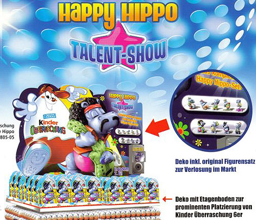 Das Bild zeigt einen vergrößerten Bildausschnitt des Werbeblattes der kommenden Happy Hippo Serie. In der Mitte auf der Papptafel ist eine von den 9 Happy Hippo Figuren der Serie zu sehen. Daneben ist ein Satz Hippos, den es über eine Verlosung zu gewinnen gibt. Als Losbox dient passender Weise eine Musikbox. Darunter steht ein Sortiment von den 6er Packs der Hippos. Auf der Verpackung des 6er Packs ist eine weitere Serienfigur zu sehen.