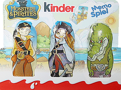 Von den Monsters & Pirates gab es diese 3 Figuren. Die Figuren sind aus Ü-Ei Schokolade. Die Verpackung ist ca. 10 cm hoch. In der Verpackungsrückseite ist ein Memory Spiel enthalten. Das Memory Spiel besteht aus 24 Karten. Auf den Karten sind alle 9 Figuren der Serie, ein Schatz sowie ein Piratenschiff abgebildet. Leider ist das Memo Spiel nur als Testware erschienen.