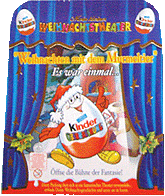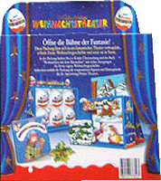 Das 6er Pack ist ca. so groß wie die Dioramen von Herr der Ringe! Nachdem die 6 Ü-Eier entnommen wurden, kann die Verpackung als Weihnachtstheater genutzt werden. Das Bild rechts zeigt die Vorderseite der Verpackung. Die Überschrift des Stückes lautet "Weinachten mit dem Murmeltier". Darunter steht noch "Es war einmal". Das Bild rechts unten zeigt die Rückseite, wo eine Anleitung steht und der Inhalt zu sehen ist. Wir gehen davon aus, dass dieses 6er Pack leider nur eine Testverpackung ist und dadurch kaum in einem Geschäft zu bekommen ist. Erwerbsmöglichkeit und zusätzliche Informationen gibt es hier: [Link zur Auktion des Weihnachtstheater]