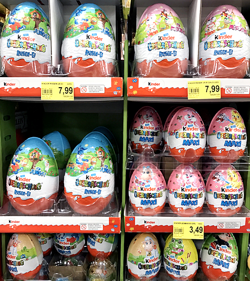 In dem Aufsteller sind die neuen Riesen Eier für Jungen und Mädchen zu sehen.