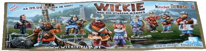 Der BPZ von Wickie hat das längliche Ursprungsformat. Oben links in der Ecke wird darauf hingewiesen, dass die Figuren "handbemalt !" sind. Daneben steht der Hinweis, dass am 09. 09. 09 der Kinofilm anläuft. Unten gibt es die Internet Adresse zum Film und rechts unten in der Ecke wird auf die Webseite von magic-kinder. com hingewiesen.