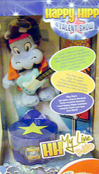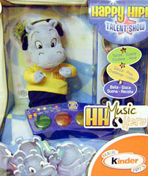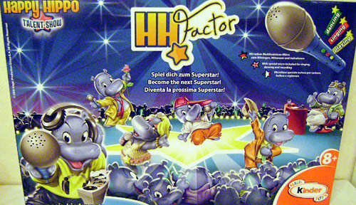 Die Happy Hippo Talent Show gibt es jetzt in Plüsch. MC Happy Hippo ganz links auf dem Bild und Tanja Tütü ganz rechts sind mit 30cm 10cm größer als die anderen Figuren. Nach unseren Informationen handelt es sich bei den Figuren um deutsche Testware. Vielleicht wird es sie in den Ferrero Piazza Ständen geben. Mit diesem Brettspiel kann jeder zum Superstar werden. Insgesamt können 8 Spieler teilnehmen. Es gibt 32 Ereigniskarten und 32 Aktionskarten. Mit dem Mikrofon müssen dann unter anderem lustige Aufgaben erfüllt werden, um dem Ziel näher zu kommen. "Endlich" gibt es was von der Sonderfigur "Toni Turntable". Es ist eine Plüschfigur mit Mischpult. Aus dem Mischpult kommt gewiss fetzige Mucke. In dem rechten Karton steckt Louis Luftgitarre, der anscheinend auf einem sich drehenden Podest stehen kann. Von Goldie Goldkehlchen gibt es auch noch eine Figur im Karton. Quelle: Diese eBay Auktionen, wo weiteres Bildmaterial zu sehen ist