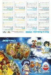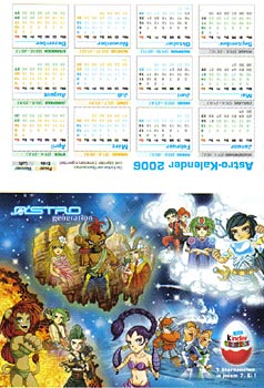 Das Bild zeigt uns einen Astro Kalender, der in der Mitte zusammengeknickt werden kann. Bei den Monaten stehen immer Sternzeichen darüber. Die andere Seite des Kalenders ein ist reines Werbemotiv zur Serie. Danke an Hans-Dieter G.