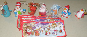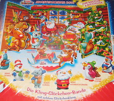 Traditionell gibt es von Ferrero wieder einen Adventskalender. Diesmal ist der Satz "Die-Kling-Glöckchen-Bande" enthalten. Das besondere an der Serie ist nicht, dass die Figuren am Christbaum angehängt werden können ;-), sondern das jede Figur mit einem echten Glöckenklang ausgestattet ist. Der Satz besteht aus 7 Figuren, die auf dem unteren Bild zu sehen sind. Zu bekommen sind die ersten Sätze in [dieser eBay Auktion]