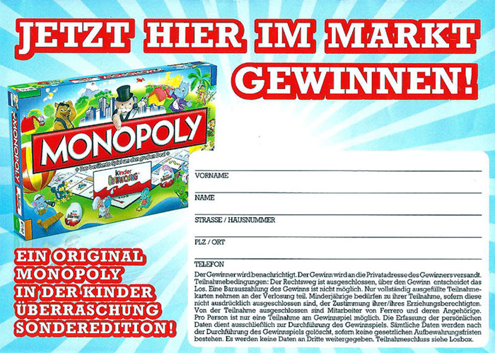 Jetzt die Augen offen halten beim Ü-Ei Kauf. Mit dieser Gewinnspielkarte kann eins von den Ü-Ei Monopolys gewonnen werden. Morgen bekommen wir Bildmaterial und stellen das Monopoly Spiel in einer News vor. Die Karte muss nur ausgefüllt werden und in die Gewinnspielbox im Supermarkt eingeworfen werden. Dann noch einen Schuß Glück und man kann eins von den Ü-Ei MONOPOLY Spielen gewinnen. Die Aufsteller mit den Gewinnspielkarten sind meistens nur in den großen Läden anzutreffen.
