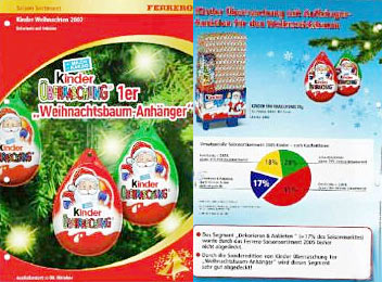 Dieses Werbeblatt zeigt Ü-Eier als Tannenbaum Anhänger. Auf dem Bild sind zwei unterschiedliche Anhänger zu sehen. Auslieferungsstart ist der 8. 10. 2007. Quelle: [Diese eBay Auktion]