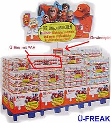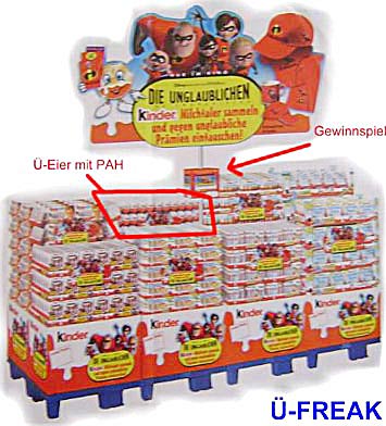 Das Bild zeig den ersten Beweis, dass im Januar die Unglaublichen in den Ü-Eier kommen. Insgesamt besteht der Satz aus 8 Figuren. Die Figuren sind wie die Polarexpress Figuren aus mehreren Teilen. Hier die Namen der neuen Helden, angefangen unten links: Frozone, Edna, Violetta, Syndrom, Mrs. Incredible, Flash, Jack-Lack und Mr. Incredible! Mehr Detail-Daten zu den Helden gibt es unter [www. dieunglaublichen. de]. In der Mitte des Bildes ist das Logo der Unglaublichen oder in Englisch Incredibles zu sehen. Dazu kommen noch drei Fahrzeuge und zwar Jet, Flitzer und ein noch nicht benennbares Fahrzeug, die im unteren Teil des Bildes zu sehen sind. Bild Quelle: www. Collect-it. de [Die Unglaubliche Ü-Ei News an Freuden senden] Das Bild zeigt einen Aufsteller von den "Die Unglaublichen". Der rote Rahmen weist auf die Ü-Eier in dem Sortiment mit PAH hin. Der PAH wirbt aber nur für die Milchtaler Aktion und nicht für die neuen Figuren, darum ist der PAH auch überall angehängt. Neben der Milchtaler Aktion gibt es eine Gewinnspiel Aktion zu den Unglaublichen. Einfach die Teilnahmekarte ausfüllen und in die Losbox einwerfen (siehe Hinweis roter Pfeil). Teilnahmeschluss ist der 27. 12. 2004. [Quelle: Eierlei Forum, Beitrag von Ü-Freak]