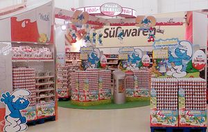 Bei Real gibt es dieses riesen Aufgebot von Ferrero. Auf dem Bild sind viele Großaufsteller und Aufsteller vom 6er Pack zu sehen. Der Angelschlumpf hat an der Angel einen Satz Schlümpfe, den es in jener Fiale zu gewinnen gibt. Interessant sind die Plüsch Schlümpfe, die unter dem Piazza Ferrero Schild hängen. Insgesamt sind es 3 unterschiedliche. Über den Plüsch Schlümpfen wird noch mit einem freudigen Schlumpf in der Zahl 50 darauf hingewiesen, dass die Schlümpfe ihren 50 jährigen Geburtstag feiern. [Von der Piazza Ferrero gibt es diesen Werbespot] Im Eierlei Shop können wir die ersten Sätze und Einzelfiguren der Schlümpfe anbieten. [Zum Eierlei Shop] Danke an Hatschi für das Foto