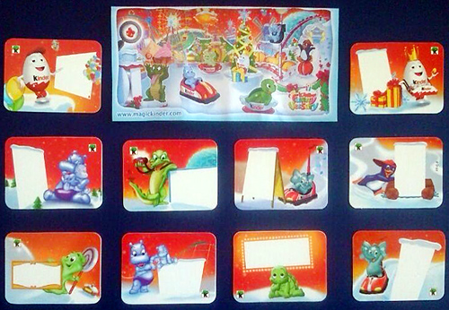 In Canada gibt es diese Sticker (Klebebilder) von der neuen Serie "Funny Versary". Auf den Stickern ist immer eine Jubiläumsfigur und eine Freifläche, wo etwas eingetragen werden kann. Die Sticker sind aus dem Maxi Ei. [Zu bekommen in dieser eBay Auktion] In Osteuropa sind die Ninja Törtels (TMNT) rausgekommen. Zu den Figuren gibt es diese 8 Klebebilder. Im Hintergrund sind die Beipackzettel zu sehen, wo die Bilder eingeklebt werden können. Quelle: [Diese eBay Auktion]