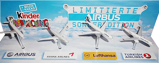 Das Foto zeigt das Diorama der neuen Airbus Serie. Im Diorama stecken die Flugzeuge auf einem besonderen Sockel. Die neue Airbus Serie besteht aus diesen 4 Flugzeugmodellen. Von links nach rechts ist es der Airbus A330-300, Asiana Airlines, Lufthansa und Turkish Airlines. Quelle: Diese eBay Auktion