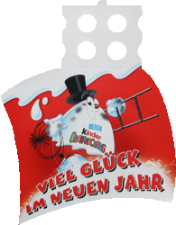 Ferrero hat für den Jahreswechsel diesen PAH rausgebracht. In der Mitte ist der Eiermann zu sehen im glückbringenden Schorsteinfeger Outfit. Darunter wird mit den Satz "VIEL GLÜCK IM NEUEN JAHR" gewünscht [Zu bekomen in dieser eBay Auktion]