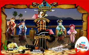 Auf der Kinderueberraschungs Webseite ist ein online Auftritt der Monsters & Pirates zu finden. Das Bild zeigt das Eingangsbild der Webseite. Alle 9 Figuren werden mit Namen vorgestellt. Der erste Navigationspunkt unten links ist "INSEL-TV", leider noch nicht aktiv :-( Der zweiten Navigationspunkt "SCHIFFE VERSENKEN" mit interessanten Segelschiffen und Kanonen. Zum Schluss kann eine E-CARD versendet werden. Insgesamt stehen drei E-Cards zur Auswahl. kinderueberraschung. de